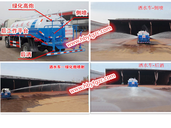 專用功能介紹: 采用武鋼優(yōu)質(zhì)碳鋼板一次卷壓成型。配備專用灑水泵,前噴后灑、側(cè)噴、后工作平臺(tái)及灑水高壓炮。灑水泵自吸高度為6米左右,整車灑水寬度14米左右,灑水炮射程28米左右,后工作平臺(tái)水炮可調(diào)成:直沖狀、大雨、中雨、小雨、毛毛雨,整車帶消防接頭、自流閥及自吸功能。附送2根3米水管,1個(gè)爬梯,兩側(cè)及后保險(xiǎn)杠。 銷售熱線:13774122777孟部長(zhǎng)